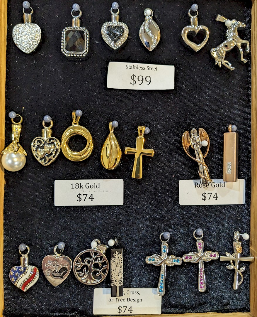 These are necklaces which each have the capability to store a small amount of ashes in. Each can be worn as often as you would like and provides a daily remembrance of your loved one. Prices vary from $74-$99