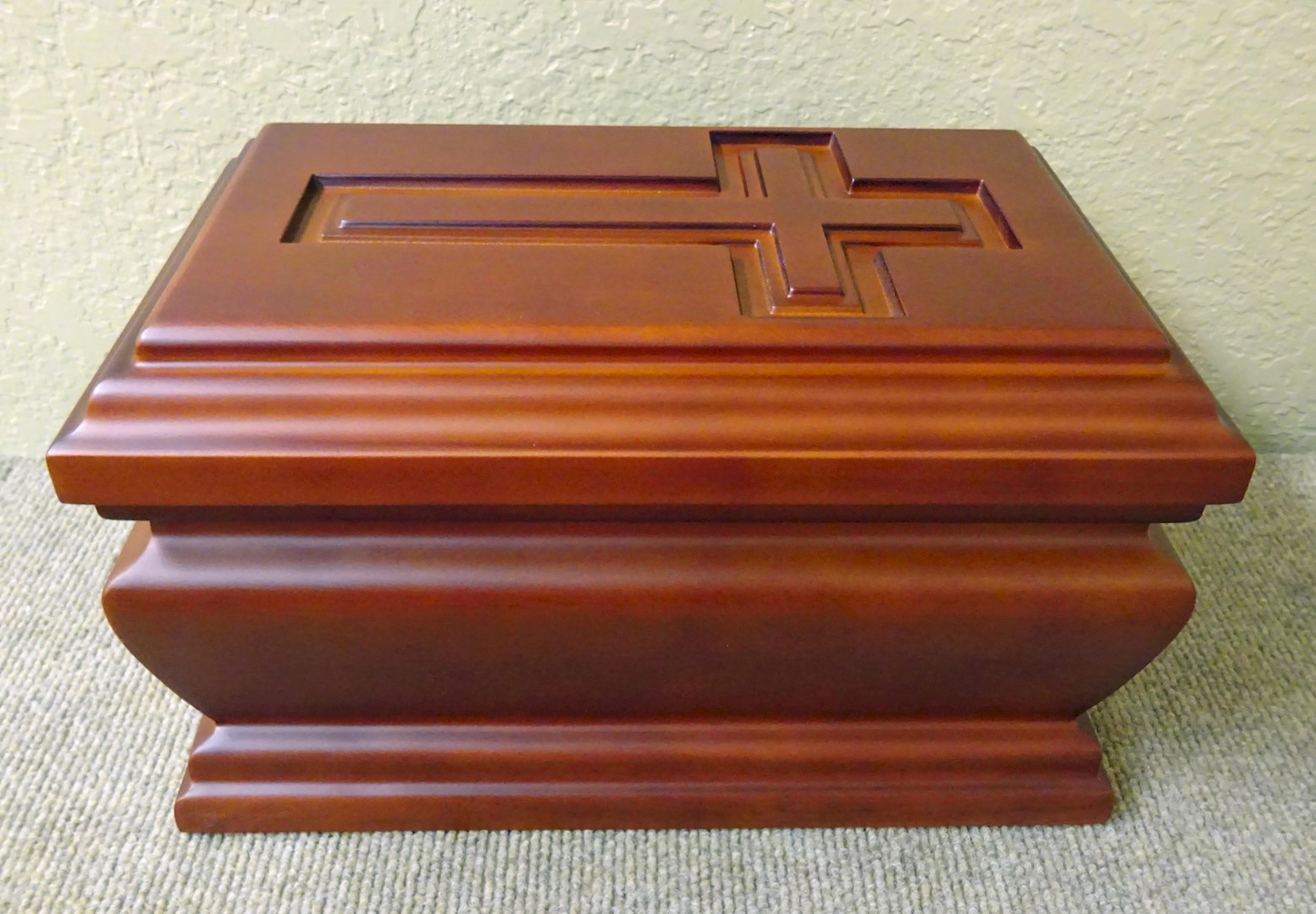 This urn has a dark brown finish and an elegant cross design on top.