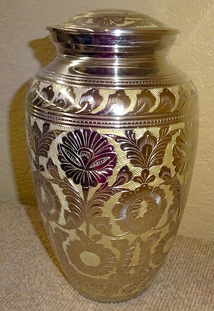 This genuine solid brass urn is handcrafted in a silver gold finish.