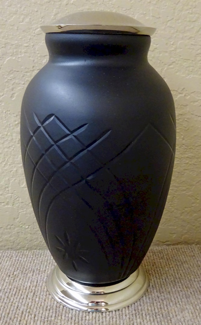 This gorgeous hand cut art glass urn has a brass lid and base both finished in a silver tone.