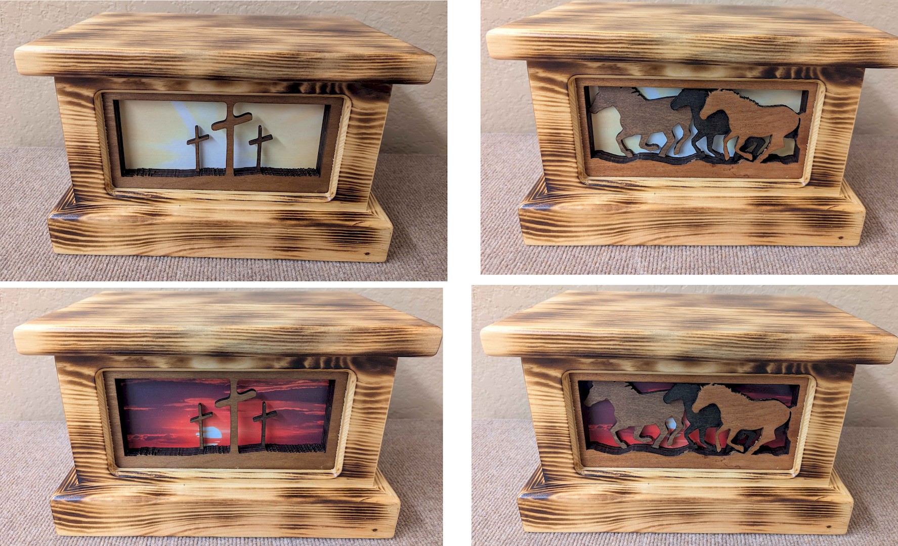 Burnished Pine (made in Montana) with personalized inserts (crosses or horses with sunrise or sunset background)