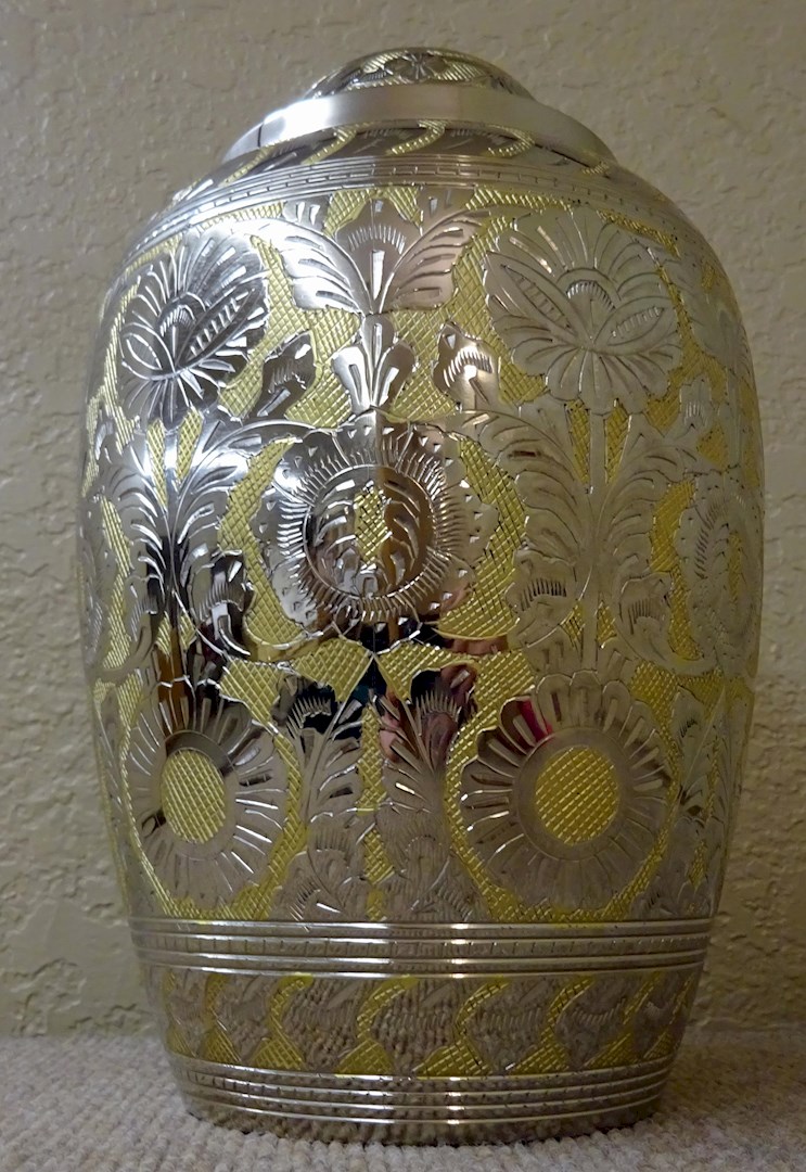This beautiful urn is solid brass and handcrafted with a silver gold finish.